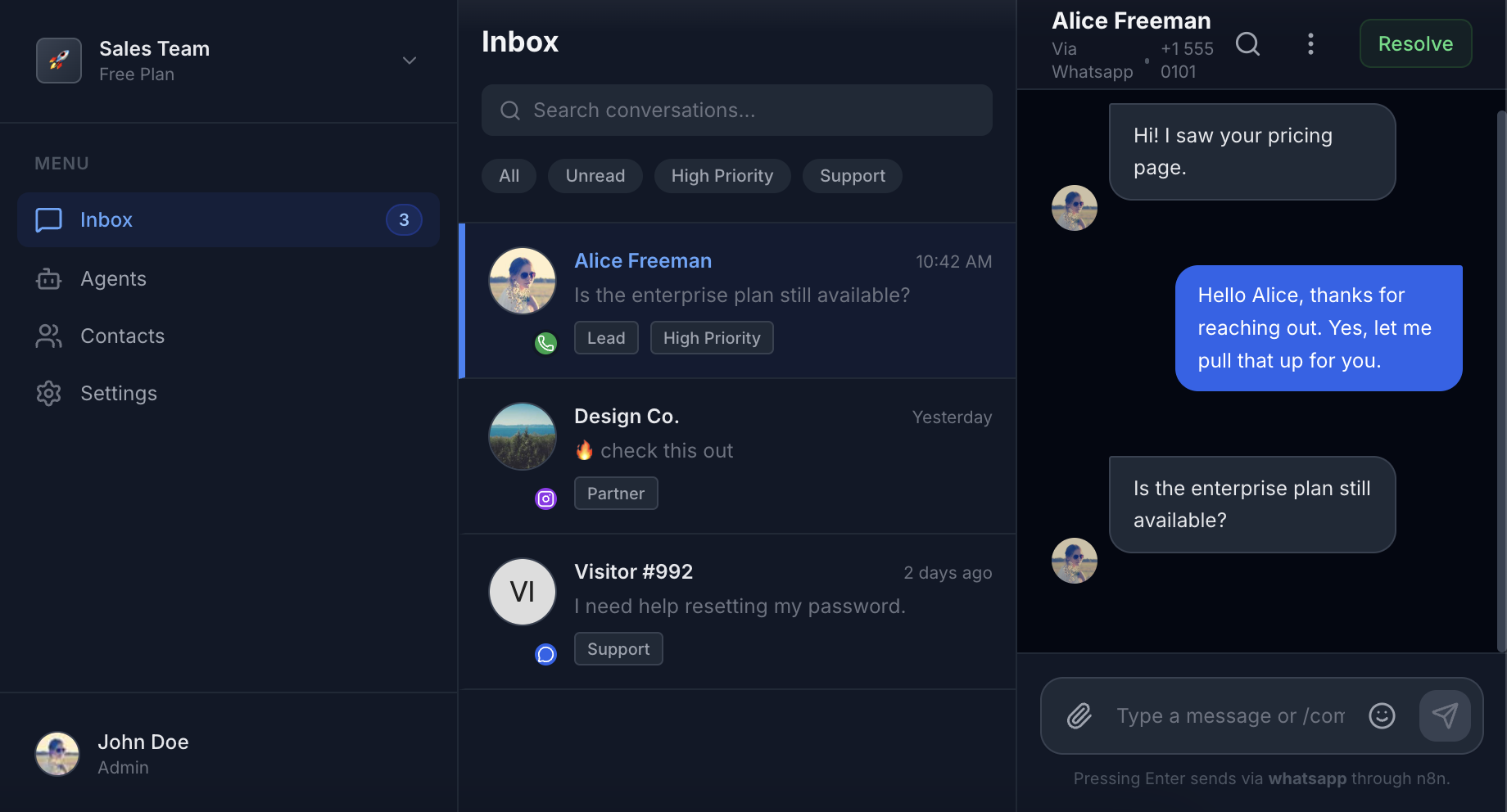 Unified inbox & control surface for AI agents - UI in frontend, automations in n8n, channels: Webchat, WhatsApp, Instagram.